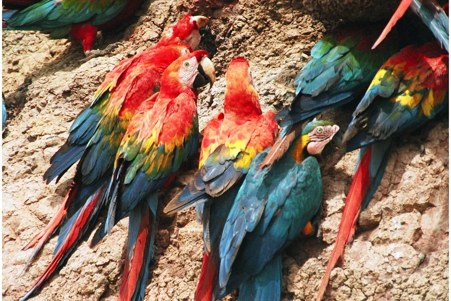 On most clear mornings of the year, dozens of large macaws and hundreds of parrots congregate on this large river bank in a raucous and colorful spectacle that inspired a National Geographic cover story: the macaw clay licks. Discretely located fifty meters from the cliff, we will observe Green-winged, Scarlet, and Blue-and-gold Macaws and several species of smaller parrots descend to ingest clay. Outings are at dawn when the lick is most active.